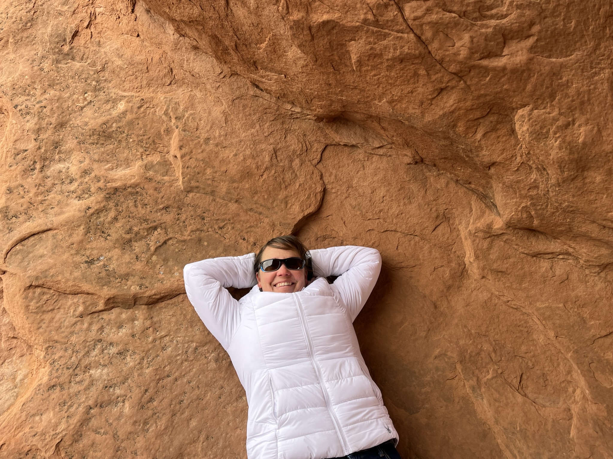 I have only been to Eye of the Whale Arch twice, because it requires 4 wheel drive to get to it -- or a very long hike. In December of 2022, we had our suburban with us in Moab, so we decided to go see the arch again, since we hadn't seen it since 1999. The road definitely does require 4 wheel drive, but if you start on the road right across from Balance Rock, keep right, and drive the 4 wheel drive trail, it is not as long or as difficult as if you come in from the other side. There is a parking pull-out for Eye of the Whale Arch, and it's just a short walk from the parking "lot" to the arch. While you're there, don't miss the other arch in Herdina Park, Leaping Arch, which is only a short walk from Eye of the Whale. I had read somewhere that if you go around the right side of Eye of the Whale you'll see an abandoned car there from the 50's. Unfortunately, I forgot about it while I was at Eye of the Whale this December, or else I would have hiked around and looked for it! I guess I'll have to go back again someday! Once you walk to the arch it is very easy to climb up the right side and under the arch. You can also climb through the other side of the arch down into the valley, if you feel so inclined. I didn't do this because I am afraid of heights, so I just stayed inside the arch and enjoyed the view.