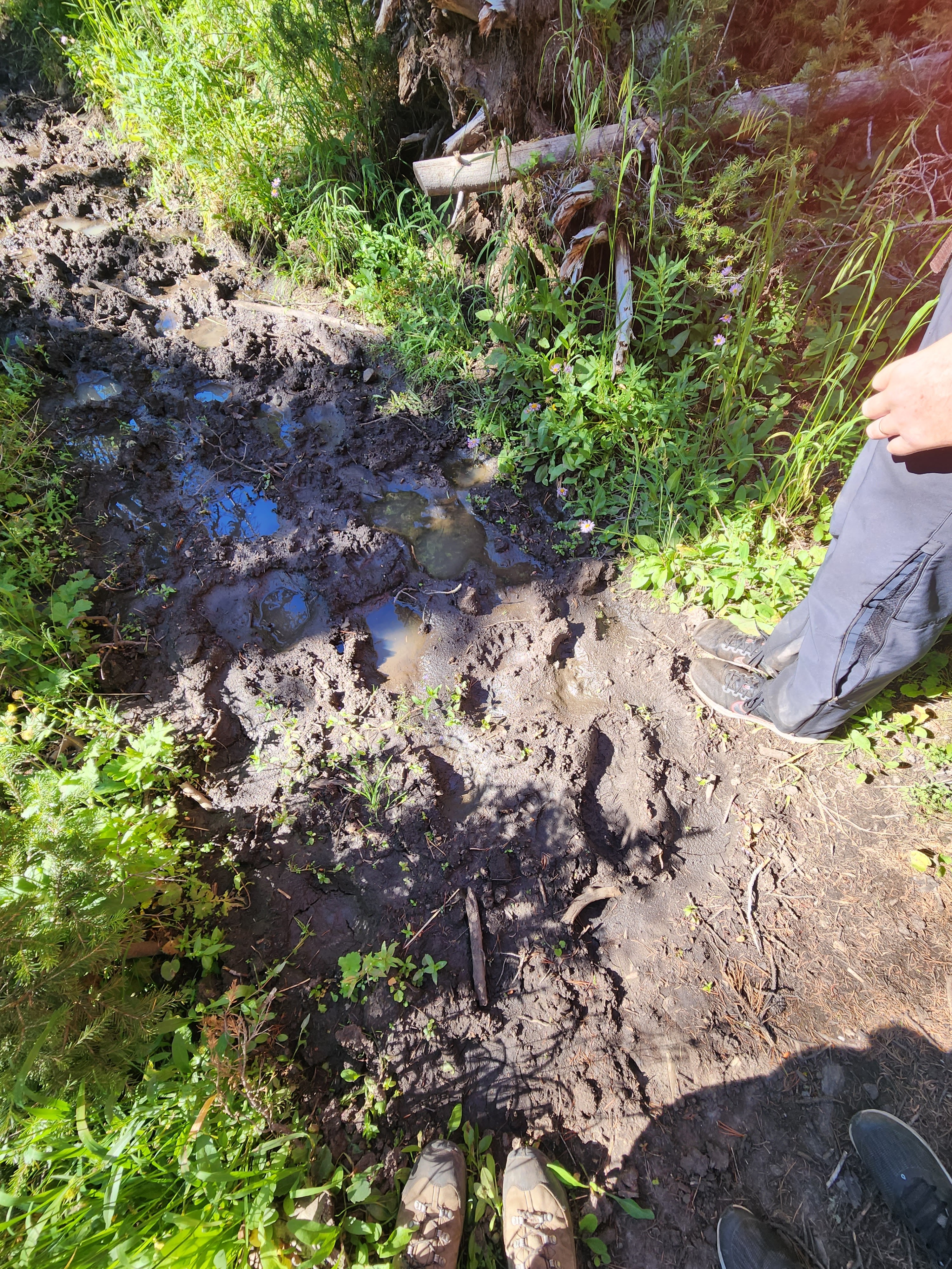 we walked through quite a bit of mud. Sometimes we were able to stick to the sides and not get too muddy. Notice the bear print mixed in with others. We also saw elk prints. |